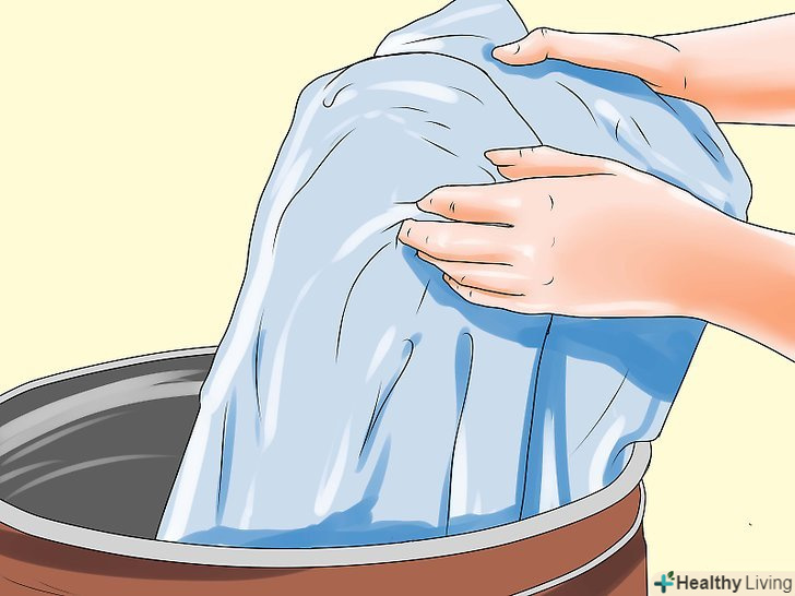 Виперіть одяг, щоб позбутися від масляних плям і бруду. виперіть предмет одягу так, як ви зазвичай це робите – в пральній машині, гарячою водою. Ні в якому разі не використовуйте ніяких кондиціонерів для білизни або пральних порошків з добавками. Найкраще використовувати пральний порошок без ароматизаторів. Якщо у вас стара пральна машина, рекомендується використовувати засіб для миття посуду Dawn. Але ніяк не більше однієї чайної ложки на метр тканини. Цей крок передбачає підготовку тканини до фарбування шляхом видалення всіх забруднень. Не кладіть тканину або предмет одягу сушарку по завершенні цього кроку.
