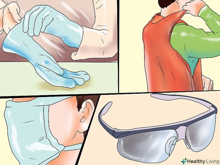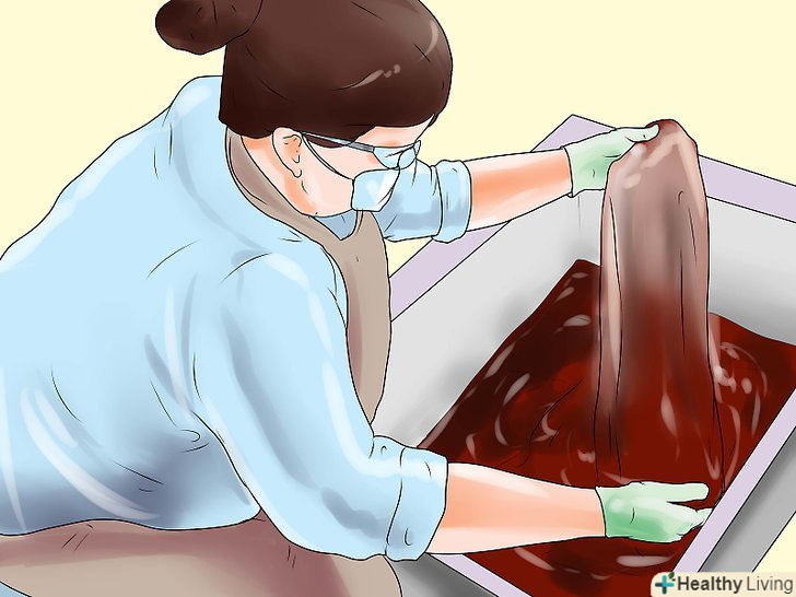 Одягніть особисті засоби захисту. перед тим, як починати процес, вам потрібно надіти гумові рукавички, фартух, захисні окуляри і респіратор. Респіратор і захисні окуляри запобігають потраплянню тонкомолотого порошку фарби в очі, ніс і рот, що може викликати роздратування. Рукавички і фартух запобігають фарбування фарбою ваших рук і одягу – якщо ваша шкіра забарвиться дисперсною фарбою, то її буде дуже складно вивести.