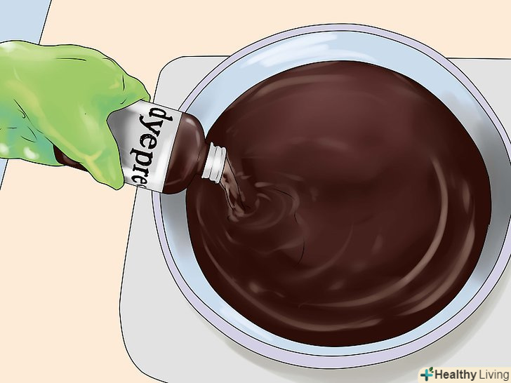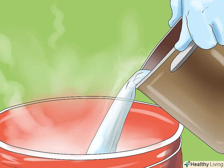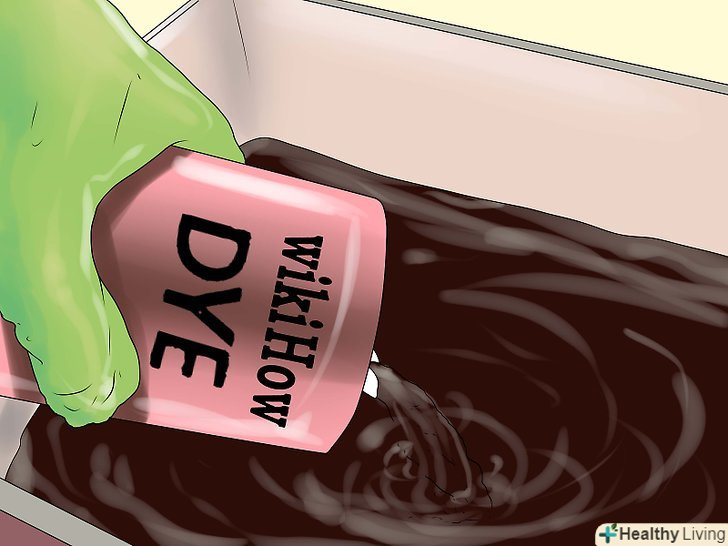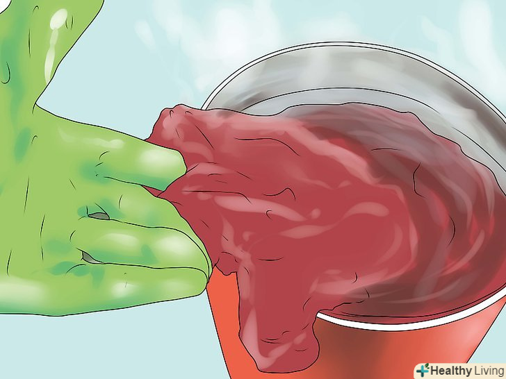 Розчиніть порошок барвника. додайте потрібну кількість барвника в маленьку чашку гарячої води. Для отримання блідого кольору буде достатньо 1 чайної ложки (5 мл) барвника, для більш насиченого кольору додайте 3 чайних ложки (15 мл). Ретельно перемішайте барвник до його розчинення дерев'яним або сталевим інструментом – не використовуйте алюміній, і не беріть ложку, яку маєте намір згодом використовувати для приготування їжі. Якщо барвник розчинився в повному обсязі, то перед використанням процідіть вийшла кашку через марлю. Зараз маску можна зняти. Коли порошок розчиниться, дихати стане безпечно.