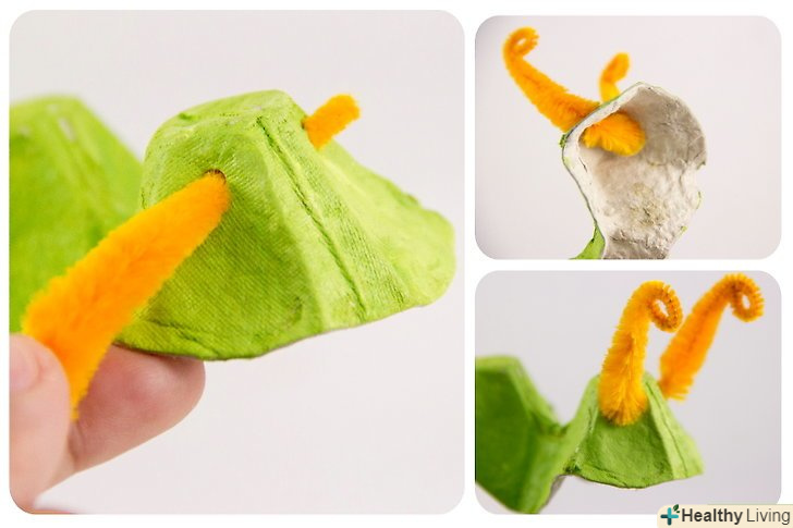 Протягніть Жовті чистячі трубочки через отвори. направте їх вгору, як антени, обрізавши при необхідності. Приклейте трубочки всередині заготовки.