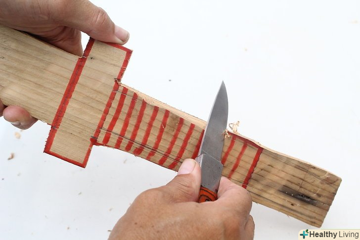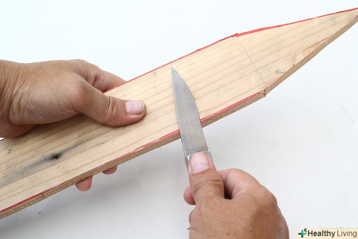 Зріжте зайву деревину, щоб виточити контури леза меча. найкраще використовувати для цих цілей спеціальний гострий ніж для деревообробки, але також можна взяти і будь-який інший міцний гострий ніж. Зріжте їм зайву деревину, щоб виточити лезо меча. [9]- У меча з одностороннім заточуванням лезо повинно звужуватися в сторону "гострого" краю, утворюючи трикутний перетин. При цьому меч повинен стає товщі з протилежного тупого краю.