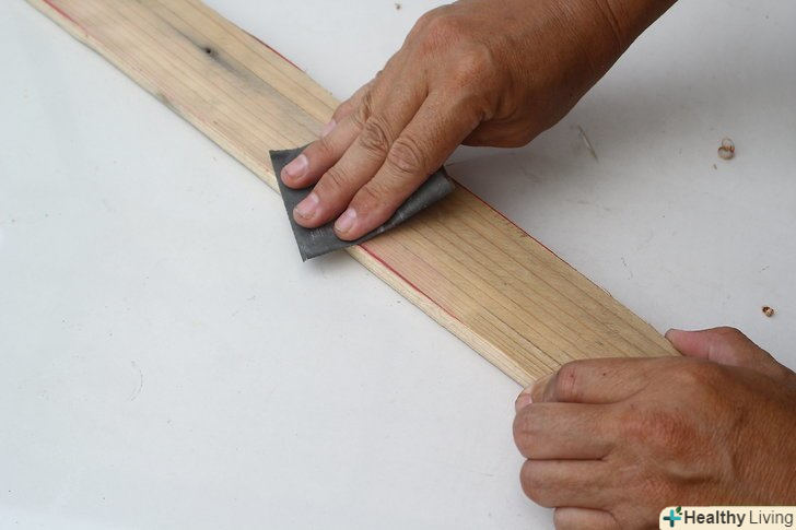 Обробіть наждачним папером лезо меча, рукоять і гарду. використовуйте наждачний папір із середнім розміром зерна (від 60 до 100), щоб згладити грубі кути і нерівності на поверхні деревини. Коли обробляєте наждачним папером деревину, тисніть на неї досить сильно.- Проявляйте терпіння під час роботи. Обробка наждачним папером вимагає деякого часу, але добре оброблений меч буде виглядати більш професійно.