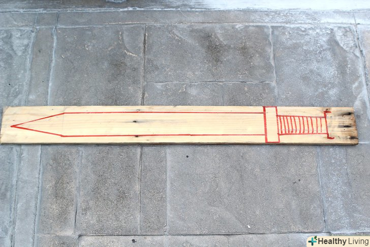 Намалюйте контури меча на боковинах бруска з перетином 5х10 см. Форма меча може бути зігнутою, як у традиційної катани або ятагана, або прямий з обох країв, але зі скошеним або загостреним у вигляді трикутника кінцем.- Коли будете креслити контури, не забудьте про поперечну гарду. Вона розташовується між підставою леза і рукояттю меча. [7]