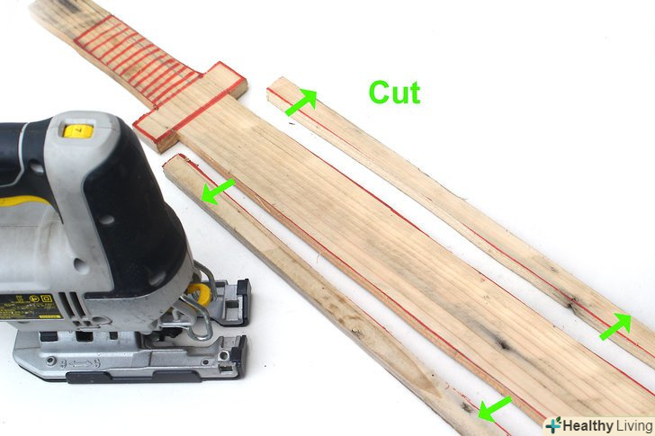 Укоротите брусок до потрібної довжини. відміряйте на бруску ідеальну довжину для свого меча і поставте олівцем відповідну мітку. Ручною пилкою відпиляєте надлишки деревини. Не забудьте, що вам слід пиляти деревину у напрямку скосів контурів намальованого кінчика меча. [8]