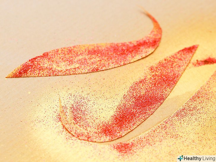 Закінчіть крила. складіть аркуш паперу, на якому намалювали крило, навпіл, щоб вирізати відразу дві однакові деталі. Виріжте крила. Нанесіть клей ПВА на дротяні крила, прикладіть до них крила з паперу і дайте висохнути. Нанесіть аерозольний клей на обидві сторони крила і приклейте до нього блискітки. Струсіть надлишки блискіток.- Замість звичайного паперу можна використовувати цигарковий. Притисніть лист цигаркового паперу до каркасу з дроту, покритого клеєм, а потім обріжте зайве.
