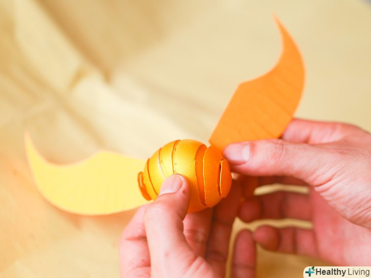 Склейте деталі разом. Приклейте половинки м'ячика з візерунками на них до цілого м'ячика на підставці. Нанесіть трохи клею на кінчик кожного крила і приклейте їх всередину спіралей. Стисніть деталі разом на кілька секунд, щоб вони склеїлися. Дайте клею висохнути, перш ніж ви знімете свій снітч з підставки. [5]