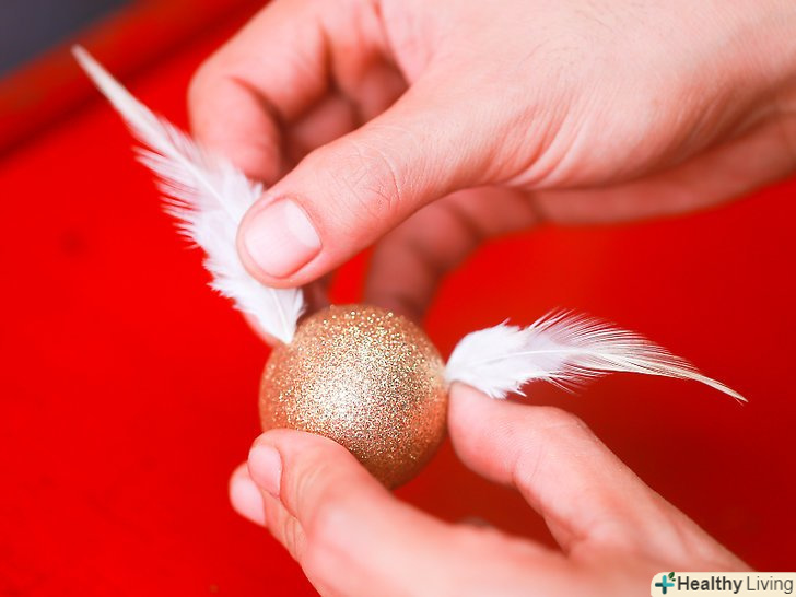 Прикріпіть пір'я. візьміть два золотистих, жовтих або білих пера, нанесіть на кінчики клей і приклейте їх до кульки.- Переконайтеся, що пір'я приклеєні до кульки строго один навпроти одного.