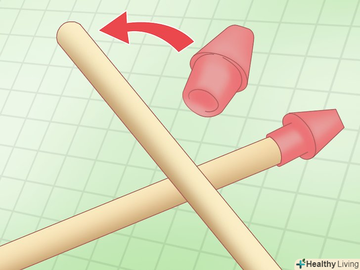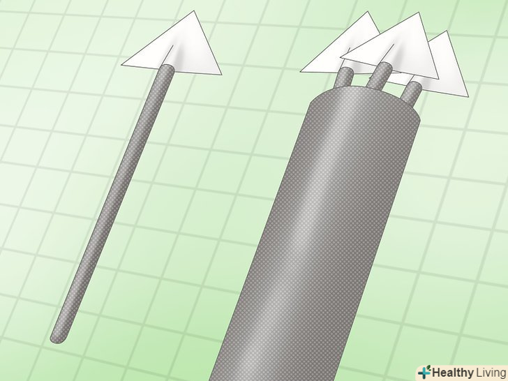 Приробити до стріл наконечники. використовуйте в якості стріл дерев'яні штирі довжиною 60 сантиметрів. Одягніть на кожен штир ковпачок з гумки, який схожий на наконечник стріли. [9]- Щоб стріли вийшли більш міцними, можна використовувати клей. Намажте клеєм кінець штиря, перш ніж надіти на нього гумку, щоб вона як слід пристала до дерева.
