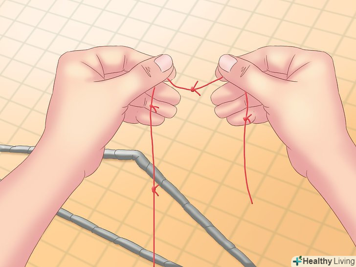 Приготуйте тятиву. для неї необхідно використовувати товсті і міцні гумки. Залежно від довжини лука і розмірів Вішалки, досить буде 3-5 гумок. За допомогою ножиць розріжте кожну гумку, щоб замість кілець У вас вийшли смужки, і зв'яжіть їх кінці простими вузлами. [2]- Щоб тятива була більш тугий, можна скласти її з двох або трьох шарів гумок.