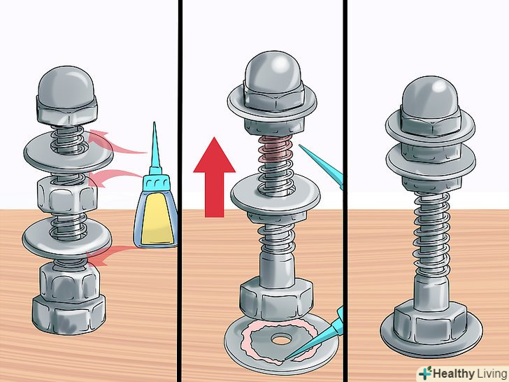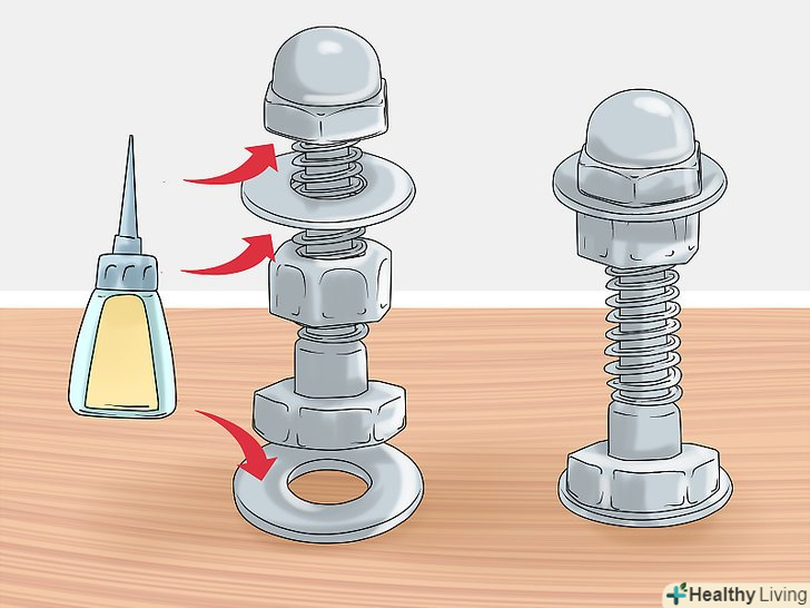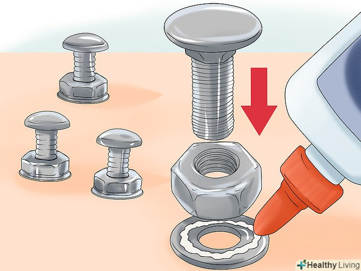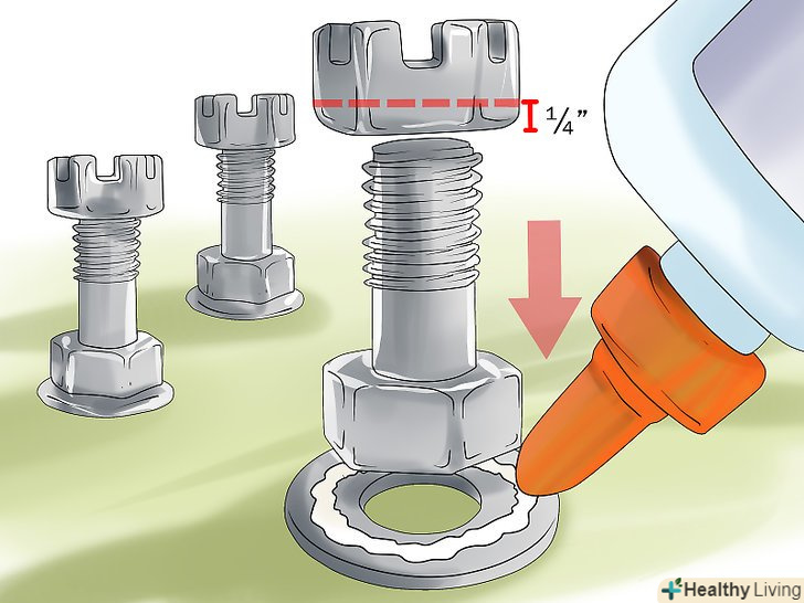 Зберіть коней. Візьміть шестигранні гайки і накрутіть їх на машинні Болти (довжиною 1½" (40 мм)) до середини різьблення. Далі накрутіть на болти баранчикові гайки врівень з кінцями болтів. Потім виконайте наведені нижче дії.- Нанесіть трохи клею безпосередньо під баранчикову гайку і підніміть до неї впритул раніше накручену на болт шестигранну гайку.
