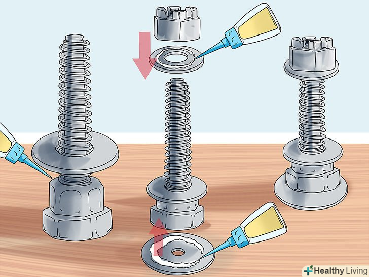 Зберіть ферзей. накрутіть на болти (довжиною 2½ " (65 мм)) по шестигранній гайці впритул до голівки. Нанесіть на Шайби клей з одного боку і наклейте їх на шестигранні гайки. Потім накрутіть на болти по другій шестигранної гайці, щоб вони виявилися приблизно на 6 мм вище перших шайб, а потім наклейте на них другі Шайби. Далі виконайте зазначені нижче дії.- Накрутіть на кінці болтів ковпачкові гайки, змастіть клеєм різьблення під ними і підніміть вгору найближчу шестигранну гайку з шайбою впритул до ковпачкової гайки.