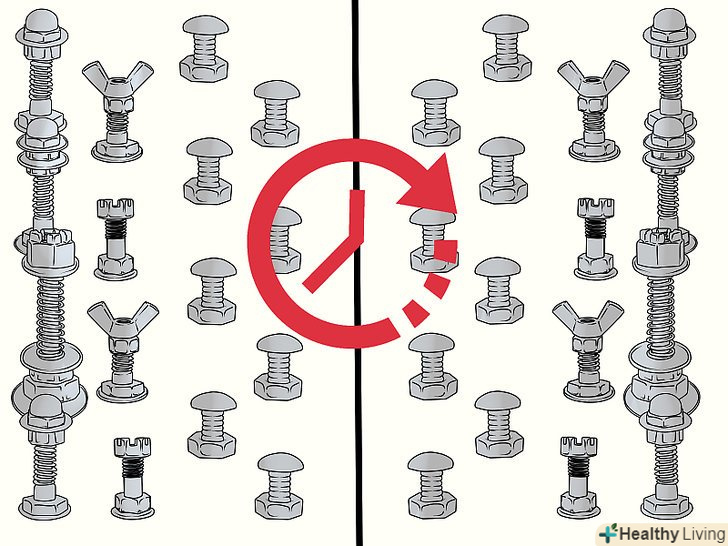 Виготовте тури. накрутіть на кінці машинних болтів корончасті гайки, щоб їх зубчики виступали. Потім послідовно наклейте на головки болтів плокіе шайби, щоб зробити фігурам підставу. [12]- Ймовірно, вам доведеться притиснути наклеюється шайбу на кілька хвилин до голівки болта, щоб клей схопився, інакше в подальшому деталі можуть розклеїтися.