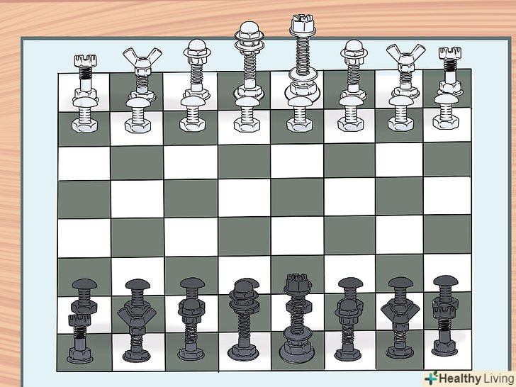 Купуйте матеріали для виготовлення пішаків. у шахах пішаки являють собою піхоту. Це найслабші фігури на шахівниці, цінність яких становить всього одне очко. [1] у повному наборі шахових фігур всього 16 пішаків, по вісім білих і чорних, і виставляють їх один навпроти одного в другому ряду з протилежних кінців дошки. Щоб виготовити пішаки, вам буде потрібно взяти:- 16 вагонних болтів довжиною 1" (25 мм, з різьбленням) ;