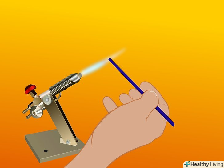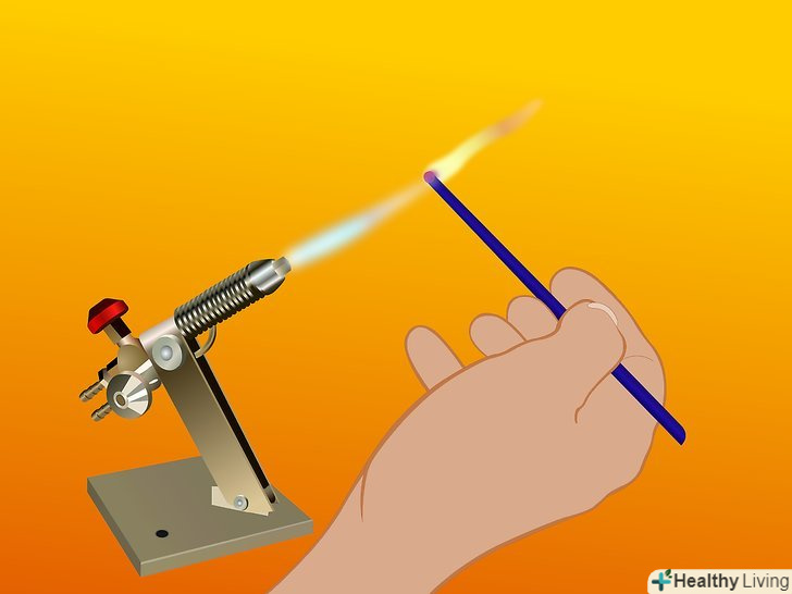 - За допомогою полум'я пальника відокремте скляний стрижень від тримача. Найлегше відокремити скло від основи, коли і воно, і тримач знаходяться в полум'ї.