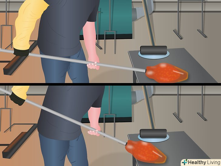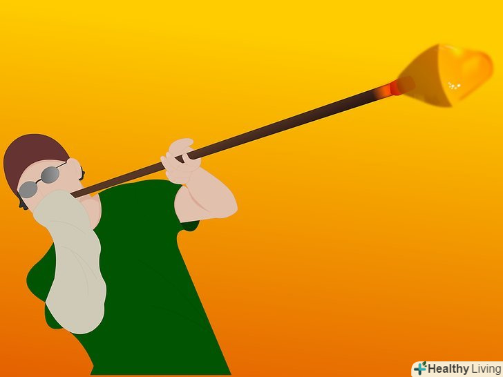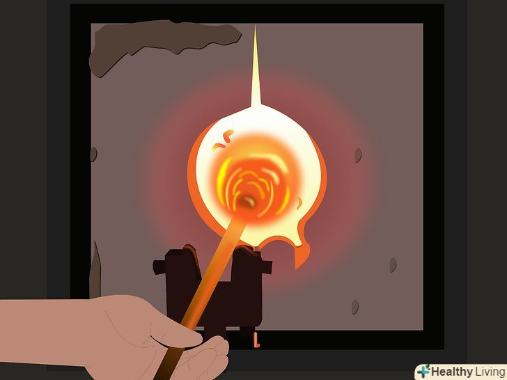 Наберіть розплавлене скло. порожнистої сталевою трубою або склодувною трубкою наберіть скломасу з печі, в якій знаходиться розплав скла. Температура скломаси в печі повинна становити від 1380 до 1435° Цельсія. [1]- Проста, але точна аналогія – загортання яблука в карамель. Уявіть, що сталевий стрижень-це яблуко, а піч – це Банку карамелі. Так само, як і в разі повільного обертання яблука в гарячій карамелі, сталевий стрижень в печі необхідно постійно обертати для рівномірного набору скломаси.