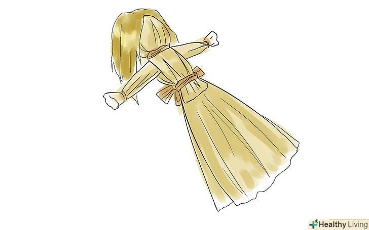 Перев'яжіть талію. використовуючи шпагат, обв'яжіть їм тіло ляльки нижче рівня рук, щоб вийшла талія. Переконайтеся ще раз, що руки знаходяться на потрібному місці перед тим, як пов'язувати на поясі, поки ви ще можете змінити його положення; руки повинні зазвичай перебувати приблизно в 4 см від талії. Як тільки ви будете задоволені підсумком, перев'яжіть талію ляльки лушпинням поверх шпагату для створення чогось на зразок ременя або пояса, приховавши тим самим мотузку. Пов'яжіть листя ззаду у вигляді банта.