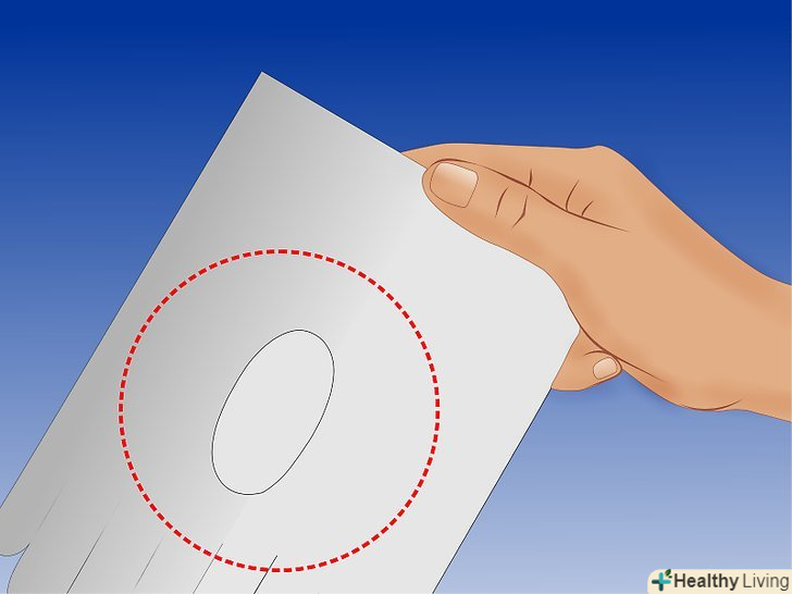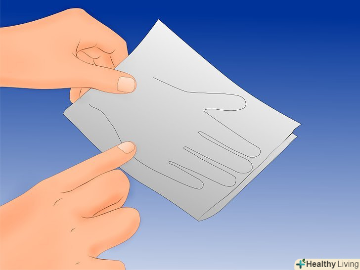 Обведіть контури своєї руки на папері. рівно покладіть свою неосновну руку на аркуш паперу, тримаючи пальці зімкнутими. При цьому ваш великий палець повинен відхилятися від долоні під природним для нього кутом. Обведіть всю руку цілком, почавши з одного боку від зап'ястя і закінчивши з іншого боку. [1]- Точка з'єднання великого і вказівного пальців повинна виявитися посередині аркуша паперу.