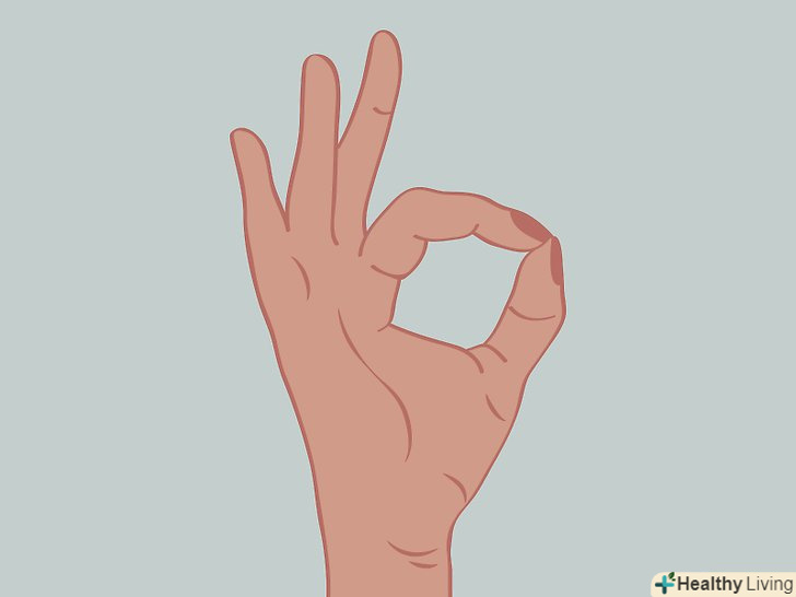 Сформуйте букву "О" З вказівного і великого пальців руки. зведіть разом кінчики великого і вказівного пальців, залишивши розслабленими інші три пальці руки. Великий і вказівний пальці повинні стикнутися кінчиками і сформувати собою коло. [2]- Немає особливого значення в тому, як будуть розташовуватися інші пальці, вони просто не повинні вам заважати.