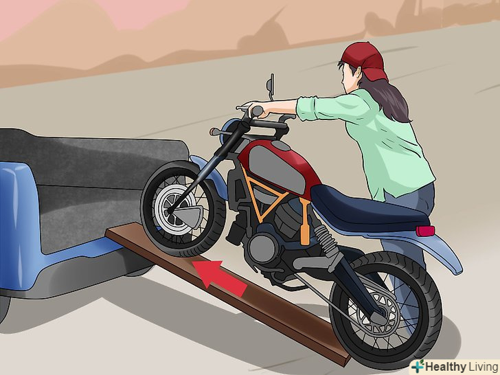 Занурте ваш мотоцикл в кузов вантажівки або на причіп.Закотите мотоцикл по рампі або за допомогою декількох людей підніміть його, щоб занурити в кузов або на причіп.