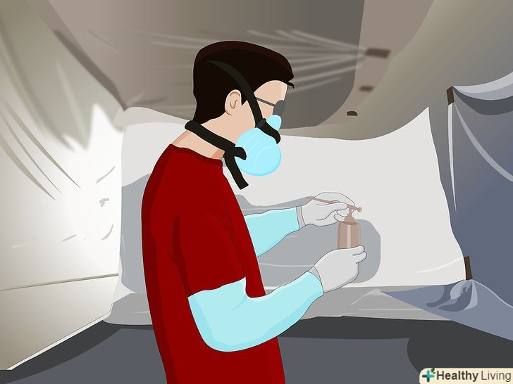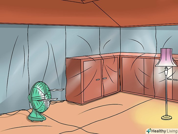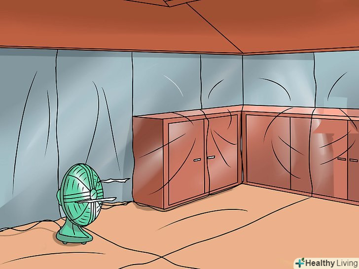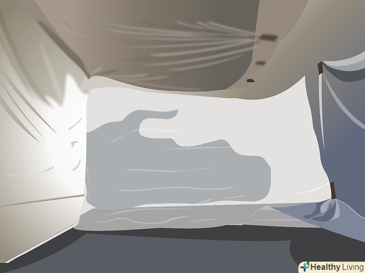 Завісьте стіни поліетиленовою плівкою.плівку можна придбати в будь-якому господарському або будівельному магазині. Купіть стільки плівки, щоб вистачило на все приміщення.- Для кріплення плівки на стіни використовуйте кнопки або молоток і цвяхи.