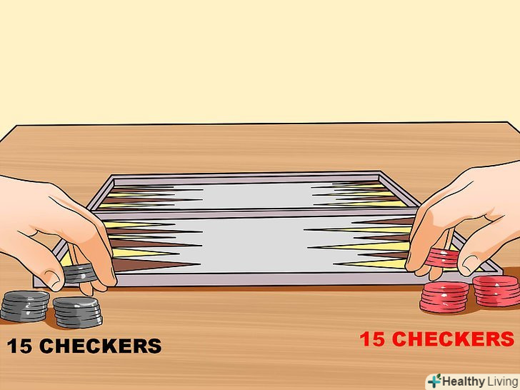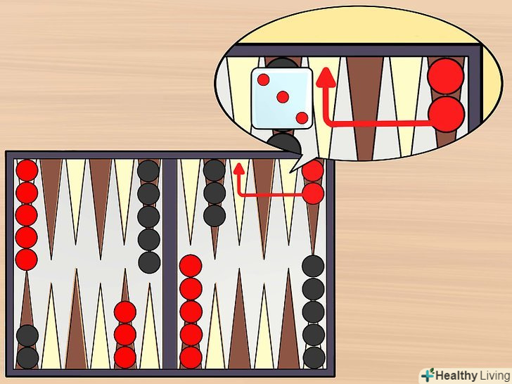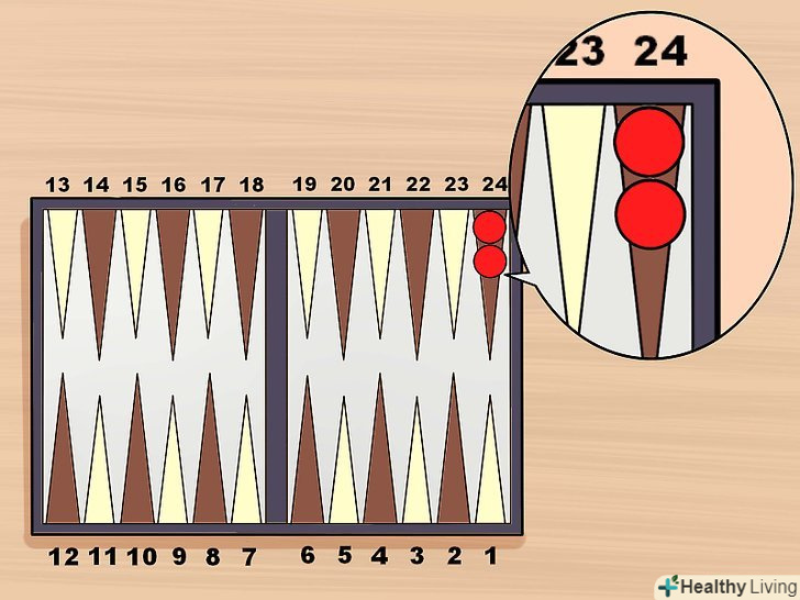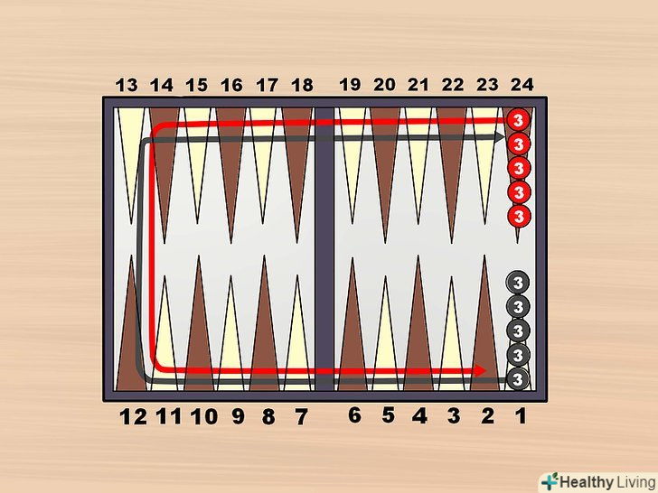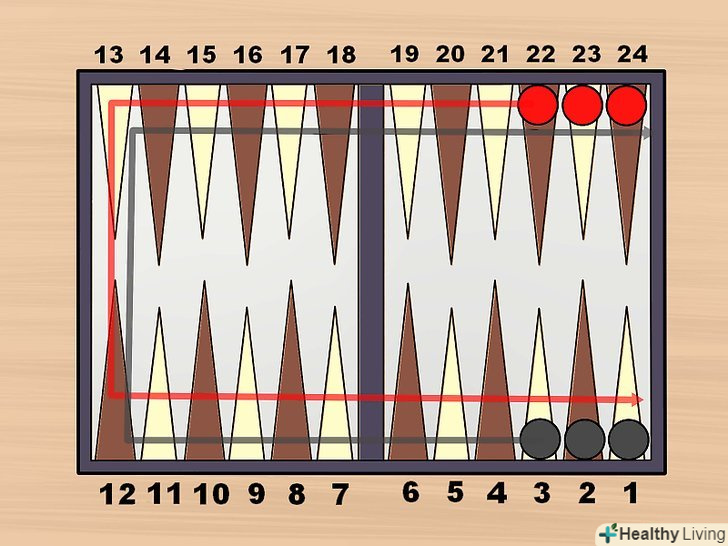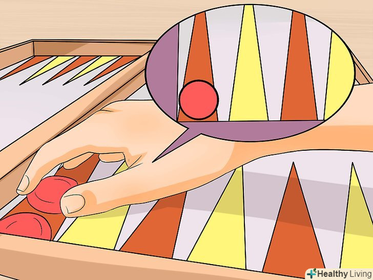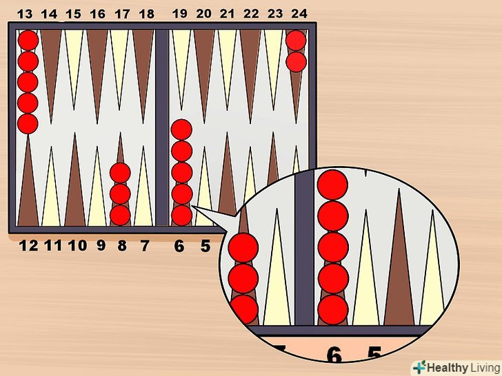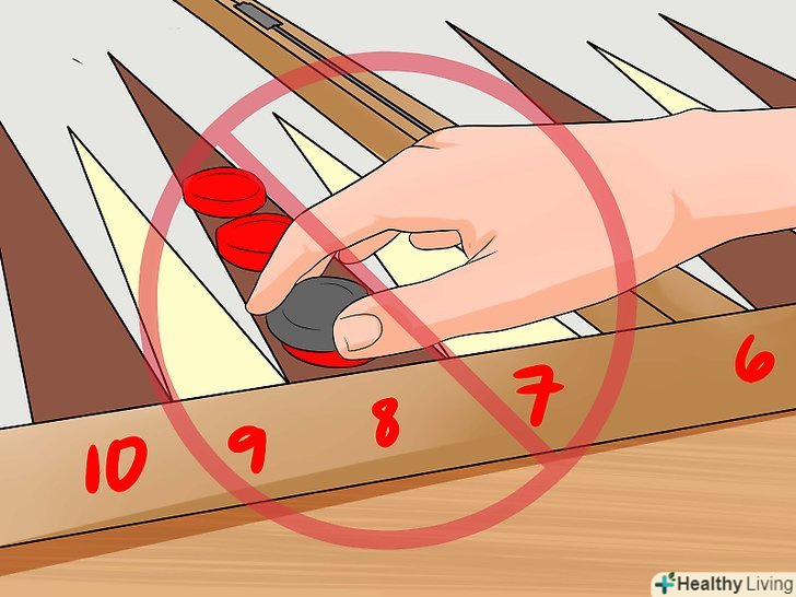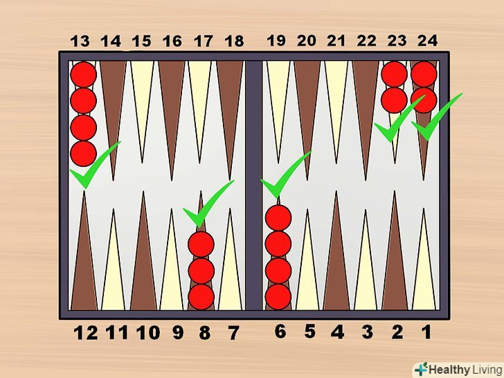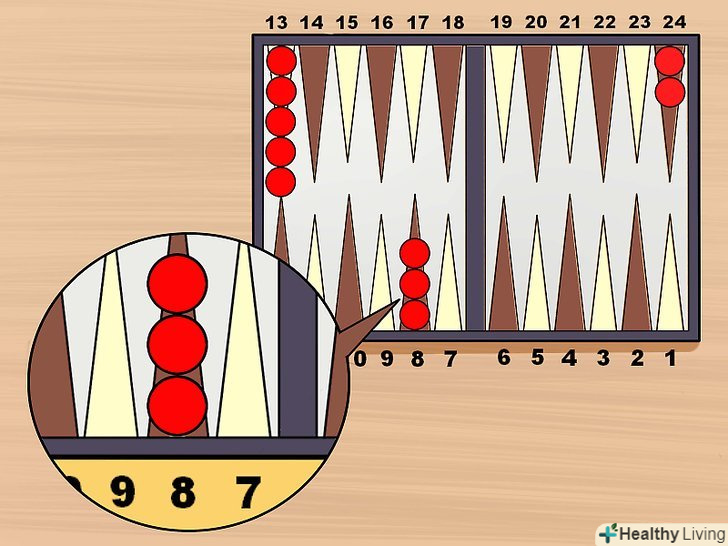 Поставте три шашки на пункт 8. восьмий пункт розташований на тій стороні дошки, де розташовується будинок гравця, це другий трикутник зліва від центру дошки. Як і раніше, якщо ви не впевнені, відрахуйте в зворотному порядку від попереднього, 13-го пункту, в який ви помістили п'ять своїх шашок. [5]