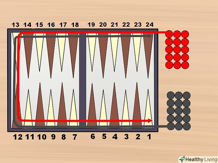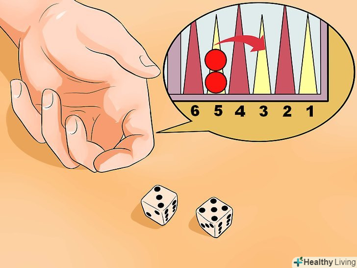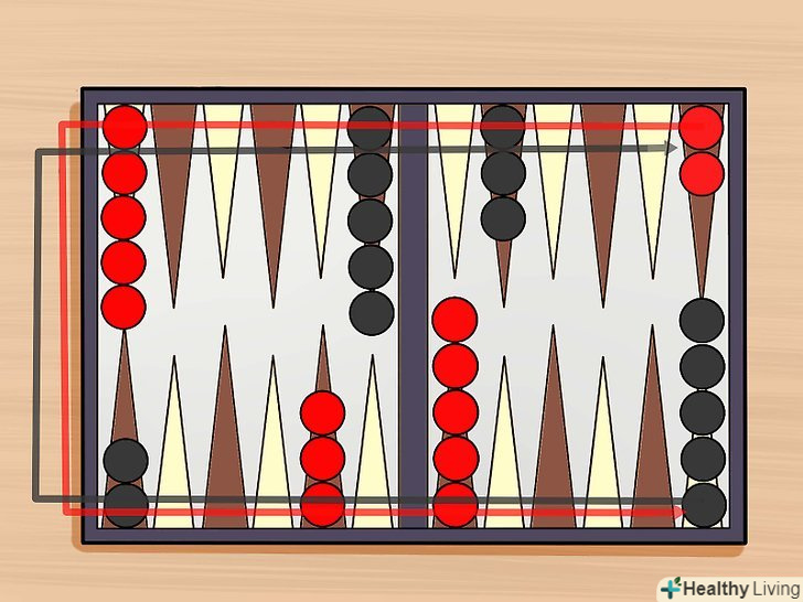 Для виграшу партії необхідно першим прибрати з дошки всі свої шашки. як тільки всі шашки гравця опиняться в його будинку, він може почати прибирати їх з ігрової дошки. Це називається"викидати шашки з дошки". Для цього потрібно, щоб на кістках випало число пункту, на якому розташована та чи інша шашка. [12]- Наприклад, якщо дві ваші шашки стоять на пункті 5, і у вас випадає 5 і 3, ви можете прибрати одну шашку з поля, а потім або перемістити другу шашку на пункт 2, або походити інший шашкою в будинку. Якщо у вас не випало числа, відповідного пункту, на якому розташовуються шашки, ви можете пересувати їх ближче до пункту 1, але потім вам все одно доведеться викинути число 1, щоб винести шашку за межі дошки.