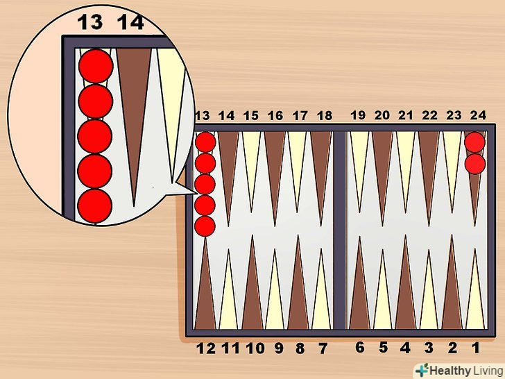 Поставте п'ять своїх шашок на пункт 13. цей пункт розташовується на тій же стороні дошки, що і пункт 24, в крайній правій точці боку противника. Щоб не помилитися, ви можете відрахувати в зворотному порядку від попереднього пункту 24, в який ви поставили дві шашки. [4]