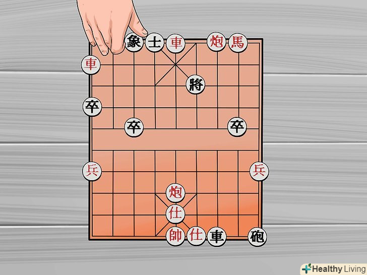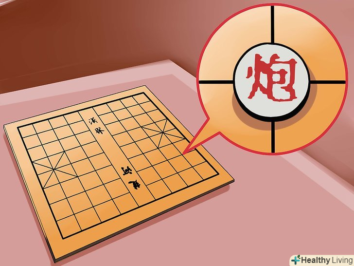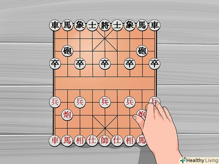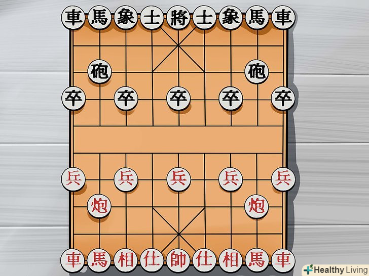 Розставте фігури на дошці. кожній фігурі відповідає своє місце на дошці, як і в звичайних шахах. Перед початком гри слід розставити фігури на покладені місця. Пам'ятайте про те, що фігури розташовуються на перетинах ліній, а не в клітинах. [4]- На найближчій до себе горизонтальній лінії розташуйте свої фігури в наступному порядку (зліва направо): колісниця, кінь, слон, охоронець, генерал, охоронець, слон, кінь, колісниця.
