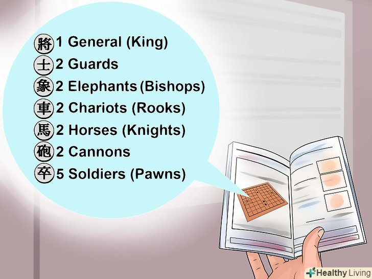 Ознайомтеся з фігурами. фігури в китайських шахах схожі з фігурами звичайних шахів. У кожного гравця є один генерал( король), 2 охоронця, 2 слона, 2 колісниці (тури), 2 коня, 2 гармати і 5 солдатів (пішаки). Фігури являють собою плоскі диски з нанесеними на них червоними або чорними знаками у вигляді китайських ієрогліфів, відповідних назві фігури. [3]