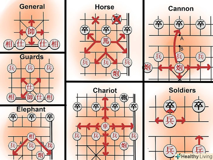 Вивчіть, як ходять фігури. у китайських шахах кожна фігура пересувається по-своєму. Для гри необхідно знати, як ходять різні фігури. Вони переміщаються наступним чином: [6]- Генерал ходить на 1 Перетин назад або вперед, вправо або вліво, але не може ходити по діагоналі. Йому також не можна залишати межі імператорського палацу. Генерал може побити будь-яку фігуру противника, що зайшла в імператорський палац, якщо тільки ця фігура не захищена інший. Генерали суперників не можуть перебувати на одній лінії так, щоб між ними не стояла хоча б одна фігура.