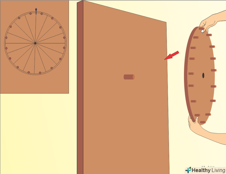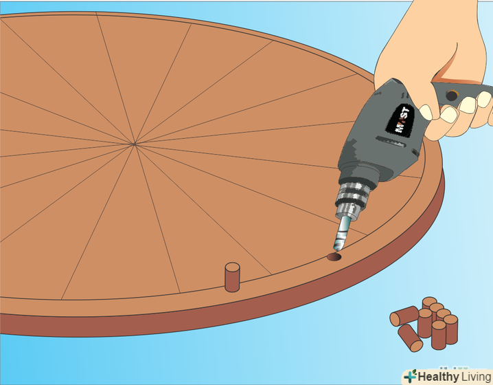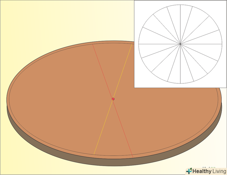 Прикріпіть до Вашого цвяха або шурупу нитку з олівцем. відступите від краю колеса 2.5 - 5 см і прокресліть коло.- Визначте інтервали. спочатку вирішіть, скільки часток буде на вашому колесі. Приклад: припустимо, ви хочете зробити 16 часток. Розділіть 360 (повне число градусів кола) на кількість часток (16), отримуємо 22.5. Запишіть дане число.