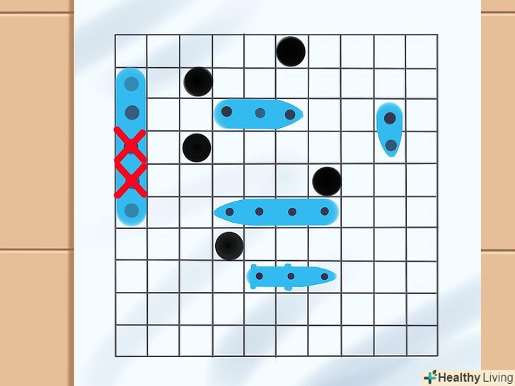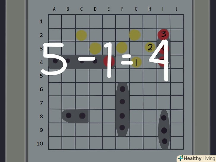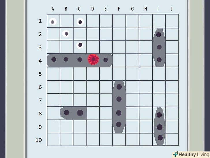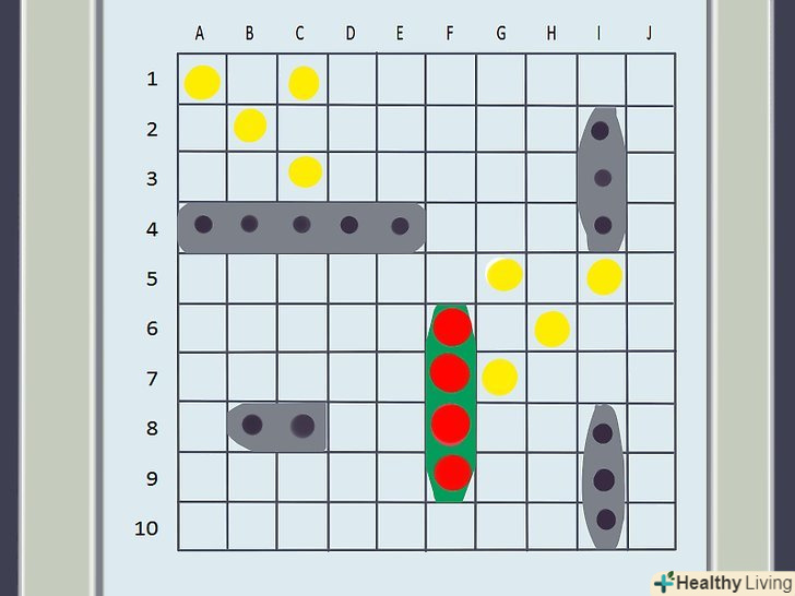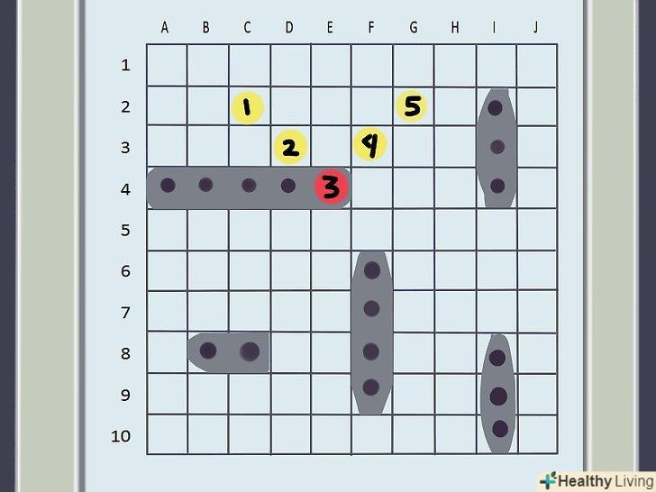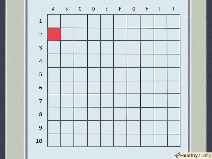 Як виконується постріл. обидва гравці використовують верхню сітку свого валізки, на якій не ставляться Кораблі, для відстеження своїх "пострілів" по кораблях противника. Щоб вистрілити, виберіть один квадрат з сітки і назвіть його координати, що включають цифру і букву.- Наприклад, верхній лівий квадрат сітки називається "A-1," так як ряд знаходиться під буквою A, а стовпець під цифрою 1.