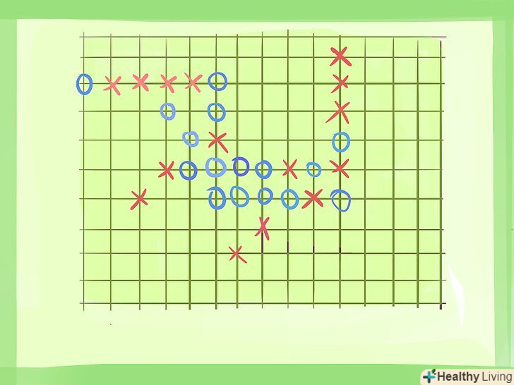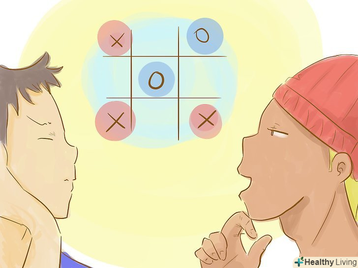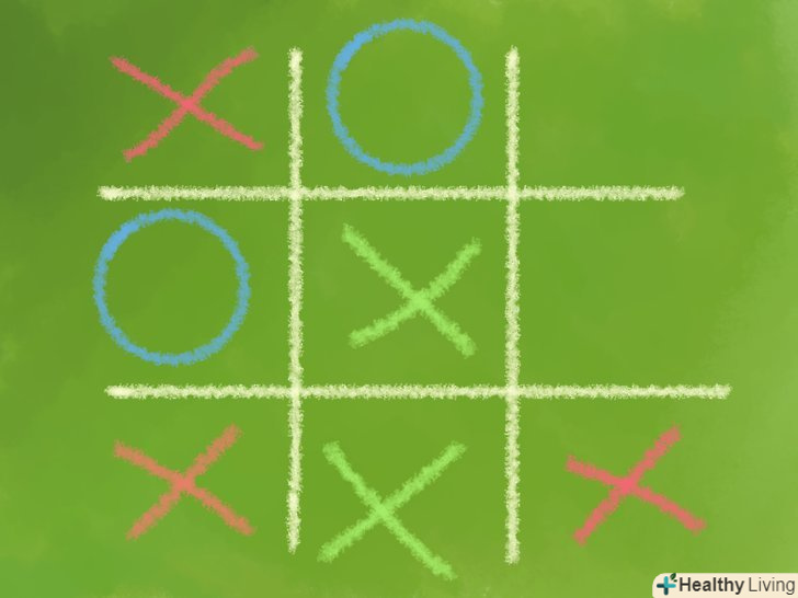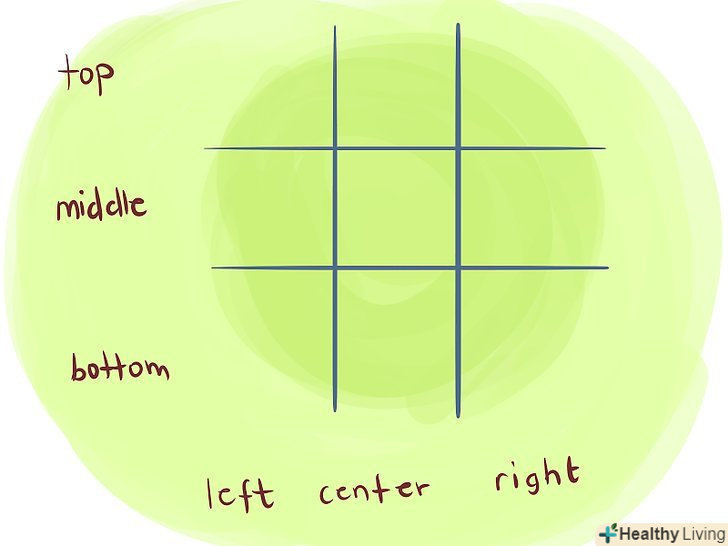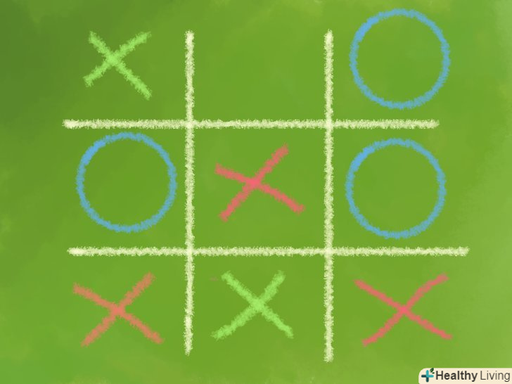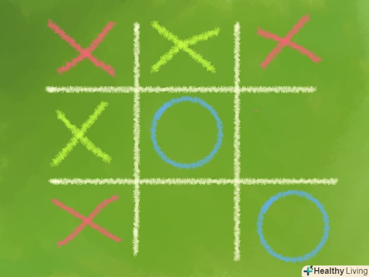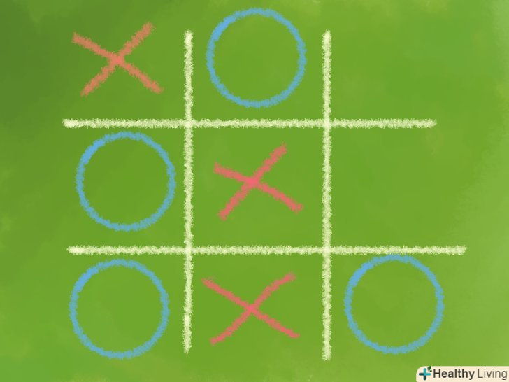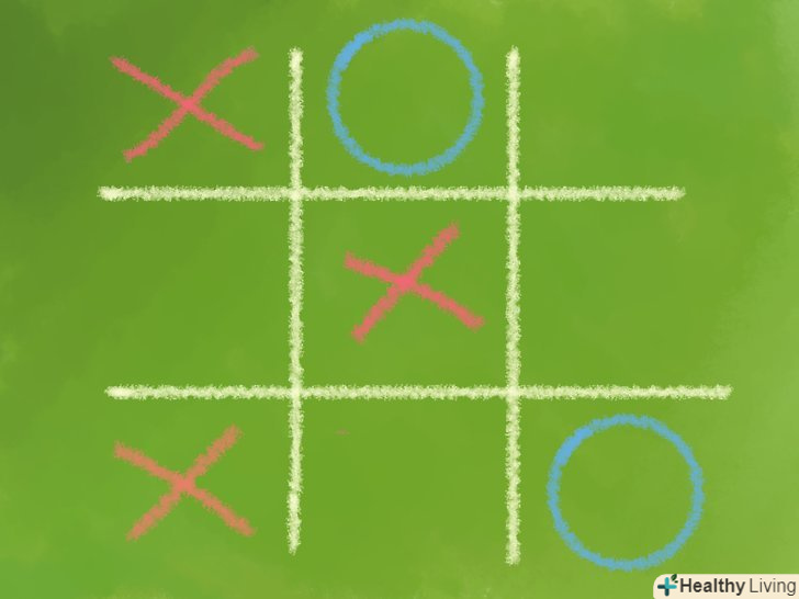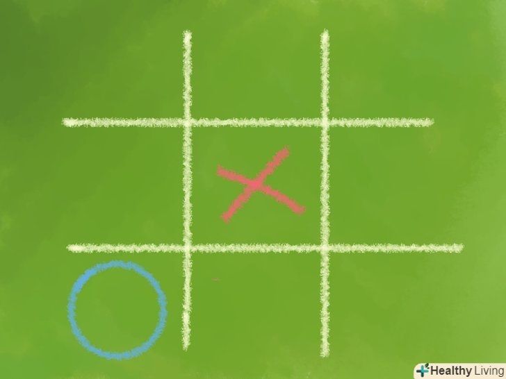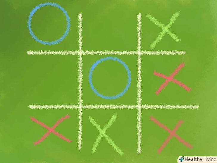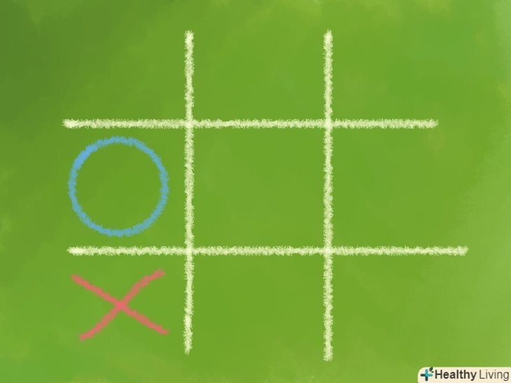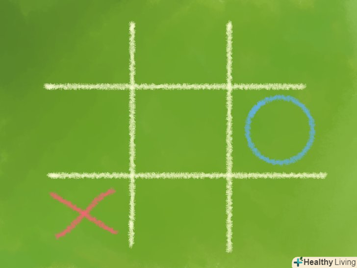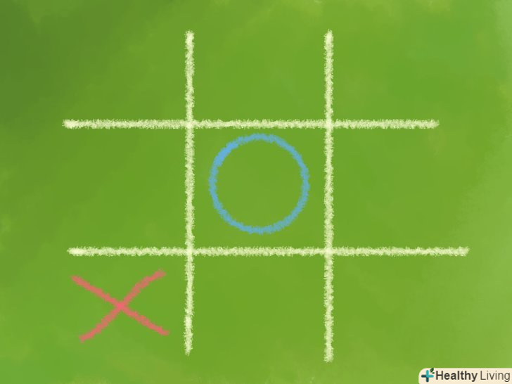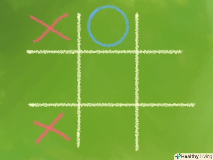Пограйте в уявні хрестики-нулики. Правила такі ж, як і в звичайних, але ігрового поля немає! Замість цього кожен гравець промовляє хід вголос, а ігрове поле представляє в голові. Ви можете використовувати стратегію, рекомендовану в цій статті, але може бути важко зосередитися, намагаючись запам'ятати де знаходяться всі Х і О.- Домовтеся про спосіб оголошення ходу. Наприклад, перше слово буде вказувати на ряд (верхній, середній, нижній), а друге — на стовпець (лівий, середній або правий).