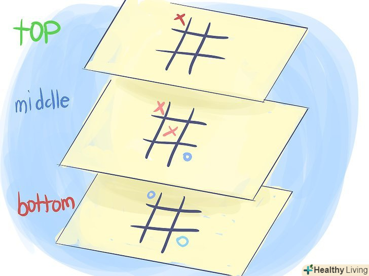 Зіграйте в об'ємні хрестики-нулики. намалюйте три ігрових поля на трьох різних аркушах паперу. Позначте їх як "верхнє», «середнє»і "нижнє". Грати на ці полях можна де завгодно — досить уявити їх у вигляді куба. [6] наприклад, якщо ви займете центральні клітини, це допоможе вам виграти гру, оскільки так вийде вертикальна лінія через весь куб.вибудувавши три в ряд на будь-якому полі, Ви також переможете. Спробуйте виграти, вибудувавши три в ряд по діагоналі, яка проходить через всі три поля.- Щоб ускладнити ще більше, об'єднайте ці варіанти і зіграйте в уявні об'ємні хрестики-нулики. Нехай перше слово позначає ігрове поле (верхнє, середнє, нижнє), друге слово — ряд (верхній, середній, нижній) а третє слово — стовпець (лівий, правий або середній).