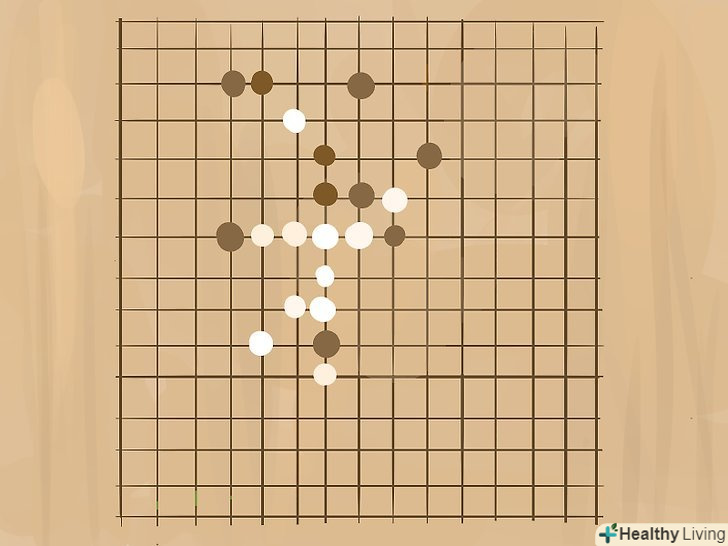 Зіграйте в «П'ять в ряд». Грайте в цю гру, яку іноді називають "Гомоку", на аркуші паперу в клітку — так вам навіть не доведеться малювати ігрове поле. Замість того щоб ставити Х і О в клітинах, ставте їх на перетинах ліній. Кожен хід ви можете зробити де завгодно на аркуші паперу. Перший гравець, у якого вийде виставити п'ять позначок в ряд (рівно п'ять а не шість), виграє. [7] ця гра напрочуд складна, незважаючи на її схожість в хрестиками-нуликами. Існують навіть світові чемпіонати по грі в неї. [8]- На змаганнях гравці грають на полях 15х15 або 19х19 клітин, але ви можете використовувати аркуш паперу в клітку будь-якого розміру. Ви можете навіть грати на нескінченно великому аркуші паперу, кожен раз підклеюючи новий лист, коли буде закінчуватися попередній.