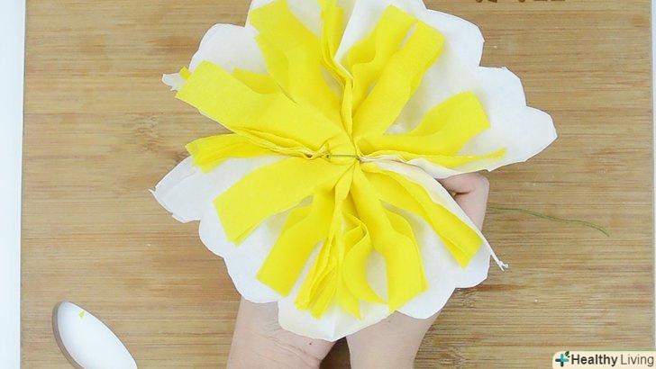 - Додайте обсягу серединці квітки. використовуючи ножиці, поріжте край жовтої смужки на тонку бахрому, роблячи паралельні надрізи на краю стрічки, яка буде формувати серединку вашого квітки. Робіть надрізи у напрямку від низу вгору, надрізаючи приблизно ⅓ ширини смужки. Коли ви розгорнете квітка, ця смужка утворює красиву, об'ємну серединку.
