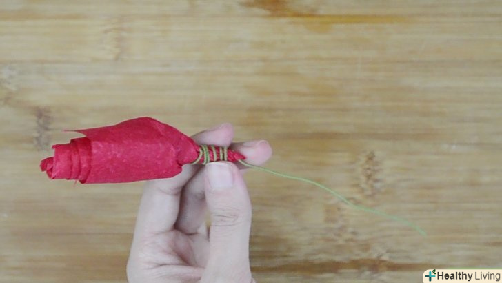 - Додайте дріт. оберніть невеликою кількістю флористичного дроту кінчик основи троянди, щоб вона підтримувала форму квітки. Ви можете відрізати дріт і прикріпити троянду до будь-якого об'єкта, який потребує прикраси, або не відрізати дріт і використовувати її в якості штучного стебла. Насолоджуйтесь вашими красивими трояндами з паперу тішью! [3]