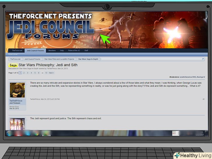 Прочитайте про філософію "Зоряних воєн" на форумах в Інтернеті. вбийте запит "Зоряні війни філософія форуми" і виберіть сайт, який вам сподобається. Читайте думки інших людей за обраними темами з фільмів і залишайте свої відгуки. Ви отримаєте краще уявлення про те, що робить всесвіт "Зоряних воєн" особливою і цікавою для людей, щоб почати насолоджуватися тими ж речами в серії.