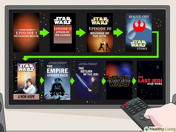 Перегляньте фільми в хронологічному порядку, щоб зрозуміти хід серії. "Зоряні війни IV-VI" вийшли до епізодів I-III (епізоди I-III є приквелами, випущеними після успіху першої трилогії), і шанувальники, за традицією, дивляться фільми в такому порядку. Однак ви також можете поспостерігати за подіями фільмів "Зоряні війни", що розгортаються за хронологією, почавши перегляд з другої трилогії, з фільму"Епізод I: Примарна загроза". Ось так фільми розгортаються в хронологічному порядку:- " Зоряні війни. Епізод I": Примарна загроза.