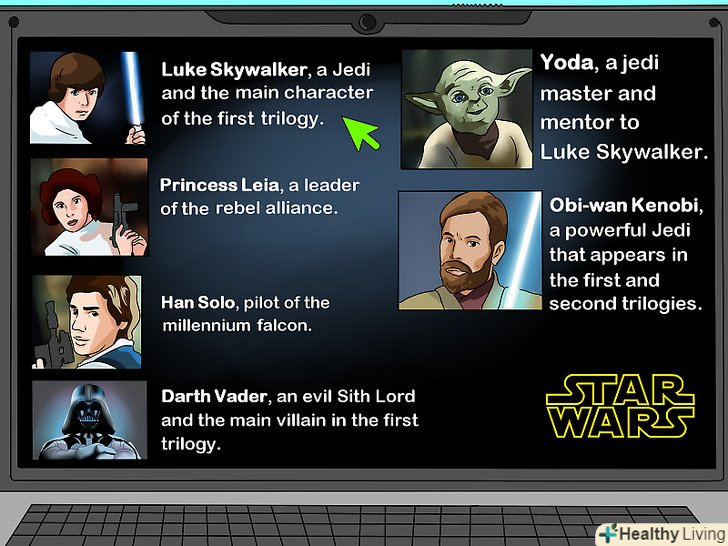 Наведіть довідки про всіх персонажів "Зоряних воєн", яких зможете знайти.Всесвіт "Зоряних воєн" наповнений безліччю різних персонажів, які в різній мірі важливі для сюжету.[12] пошукайте в Інтернеті список всіх персонажів "Зоряних воєн" з канонічної серії і вивчіть їх. Почніть деталізувати своє розуміння світу "Зоряних воєн" і того, як його формують персонажі. Ось кілька головних героїв, про які вам варто знати:- Люк Скайуокер-джедай і головний герой першої трилогії.