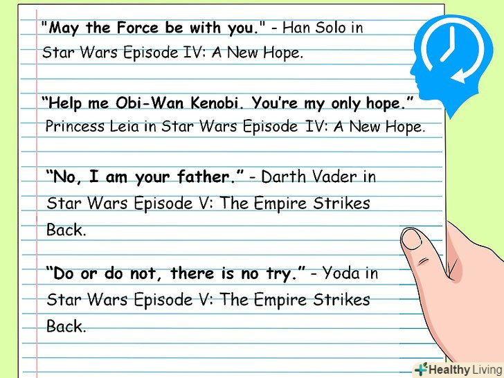 Запам'ятайте всесвітньо відомі цитати з фільмів.у істинного шанувальника "Зоряних воєн" є в запасі кілька завчених фраз, якими він може блиснути, коли потрапить в коло однодумців. Випишіть будь-які цитати з фільмів, які ви знайдете цікавими або кумедними, і постарайтеся їх запам'ятати. Повторюйте їх вголос або переглядайте сцени, в яких вони з'являються. Ось кілька класичних фраз з фільмів " Зоряні війни”:- "нехай буде з тобою сила". - Хан Соло у фільмі " Зоряні війни. Епізод IV: Нова надія".[13]