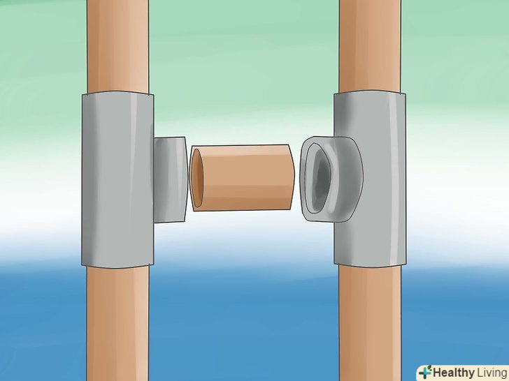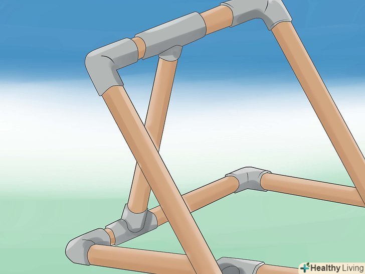 Спорудити вертикальну секцію. З'єднайте 30 см.труби з 45 см. труби за допомогою Т-образного з'єднувача. Покладіть на обидва кінці L-подібні з'єднувачі. Те ж саме зробіть з двома іншими трубами. З'єднайте дві сторони разом, приєднавши 66 см. шматок труби до L-образним з'єднанням, розташованим ближче до Т-образного з'єднання. Зробіть один шматок труби за допомогою Т-образного з'єднання і двох 30 см.труб. Потім, приєднайте вийшла конструкцію до іншого кінця загальної рами.- Всі частини повинні бути точно виміряні, перш ніж ви їх відріжете. В результаті у вам повинен вийти прямокутник. Якщо частини вашої конструкції не підходять один до одного, тоді їх можна обрізати.