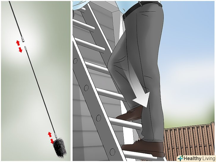 Поставте сходи і підніміться наверх. переконайтеся в тому, що на вашій даху безпечно і комфортно стояти і поставте сходи прямо біля будинку. Покладіть в сумку щітку для димоходу і подовжувачі, закиньте її на плече і підніміться по сходах.- Якщо ви відчуваєте тремтіння від думки, що вам доведеться підніматися по сходах і стояти на даху, почистіть камін знизу, використовуючи описаний нижче метод.