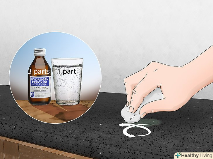 Спробуйте вивести плями від соку або води перекисом водню. якщо рідина залишила після себе пляму на стільниці, змішайте три частини перекису водню з однією частиною води. Налийте розчин на брудне місце і розітріть його чистою ганчіркою. [13]- Розтирайте розчин легкими круговими рухами.