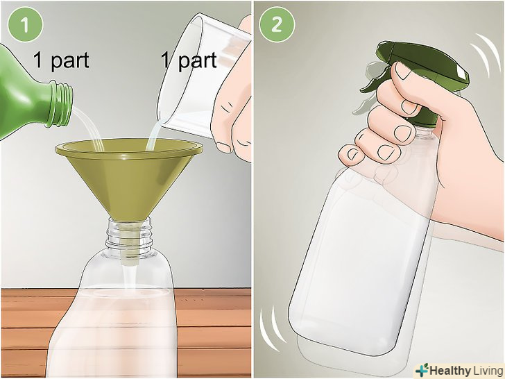 Змішайте спирт з водою, щоб дезінфікувати стільницю. залийте в пульверизатор воду і 91-процентний ізопропіловий спирт в пропорції 1:1. Закрутіть кришку і акуратно струсіть пляшку, щоб спирт перемішався з водою. [4]- Якщо ви віддаєте перевагу ароматизоване чистячий засіб, можна змішати півсклянки (120 мл) спирту, півтори склянки (350 мл) теплої води, 0,5 чайної ложки (3 мл) засобу для миття посуду і 10-20 крапель ефірного масла. Підійде масло кориці, лаванди, лимона, базиліка, апельсина або перцевої м'яти. [5]