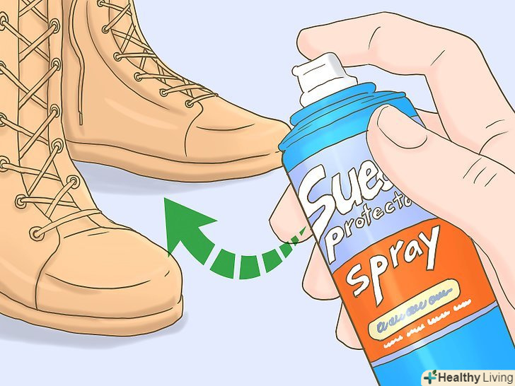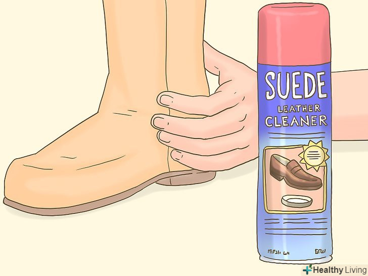 Використовуйте аерозольний спрей для замші. [1] спеціальний захисний спрей для замші можна купити в магазинах взуття, шкіри та інших місцях, де продається замша. Такий спрей захистить вашу замшу від води та інших речовин, які можуть забруднити або пошкодити ваші замшеві вироби.- Рівномірно побризкайте спреєм всю поверхню замшевого виробу, але так, щоб не промочити виріб спреєм. Дайте виробу висохнути протягом часу, зазначеного на балончику зі спреєм.