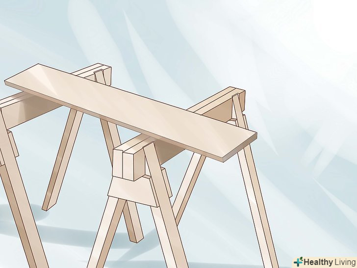Покладіть деревину на козли або на захисну підстилку в сонячному місці. якщо ви збираєтеся зістарити одну або кілька дощок, встановіть козли в кількості двох штук, щоб розмістити деревину на них. Якщо ж ви працюєте з предметом меблів або чимось ще, що неможливо укласти на козли, покладіть на землю захисну підстилку і розмістіть предмет на ній. [5]- Наявність прямого сонячного світла дозволяє прискорити дію харчової соди. Сода подіє і без сонця, але в такому випадку вона буде довше сохнути і, можливо, вам буде потрібно застосувати її кілька разів, щоб домогтися того ефекту старіння, який вам необхідний.