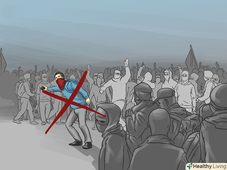 Тримайте під рукою льодяник, щоб підтримати свої сили. адреналін швидко позбавить вас енергії, а підвищення цукру допоможе вам рухатися швидше. [5]- Остерігайтеся потрапляти в місця, де для боротьби з заворушеннями застосовують хімічні речовини і зброю. щоб розігнати натовп, поліція для боротьби з заворушеннями може використовувати такі засоби: сльозогінний газ, водомети, гумові кулі. Ця зброя і хімікати можуть викликати сильний біль, дихальну недостатність і сліпоту. Спробуйте триматися подалі від передової лінії заворушень. Навчіться розпізнавати ознаки використання спеціальних засобів і дізнайтеся про правила поводження з ними.