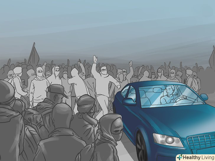 Якщо ви в автомобілі, то рухайтеся відповідно обстановці. якщо ваш автомобіль не знаходиться в центрі уваги розлюченого натовпу, залишайтеся в машині і продовжуйте рухатися якомога спокійніше. Намагайтеся триматися вулиць вільних від заворушень, також уникайте головних доріг, які, ймовірно, будуть зайняті. Продовжуйте рухатися і не зупиняйтеся, щоб оцінити ситуацію. Якщо хтось спробує заблокувати ваш автомобіль, сигнальте йому, поки він не поступиться дорогою і продовжуйте рух (зрозуміло, це не означає, що потрібно його збивати). Рухайтеся з помірною швидкістю, щоб у них був час відійти в сторону, розуміючи, що ви налаштовані дуже серйозно.- Пам'ятайте, коли ви перебуваєте за кермом, у вас перевага. Не дозволяйте деяким роздратованим людям зупинити ваш автомобіль і продовжуйте рух до тих пір, поки можете.