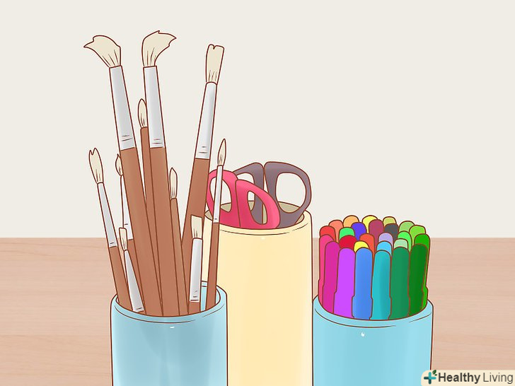 Проявіть творчий підхід, використовуючи художні приналежності в будинку. якщо у вас є фарби, маркери, крейда, кольоровий папір або інші види художнього приладдя, зберіть їх і подивіться, що ви можете придумати. Спробуйте використовувати фарби, щоб прикрасити коробки, зошити або навіть одяг, а з намистин можна створювати оригінальні прикраси. [6]- Прикрасьте взуттєву коробку кольоровим папером і розмалюйте маркерами, щоб створити капсулу часу, або декоруйте стразами рюкзак і пару туфель для школи.